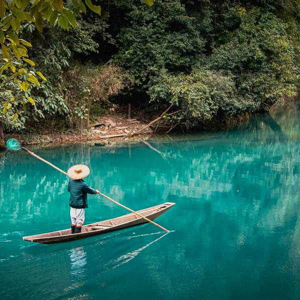 实际好像是在捞垃圾,但是河面清澈,不时抖动小舟感觉更多带有表演性质 展开