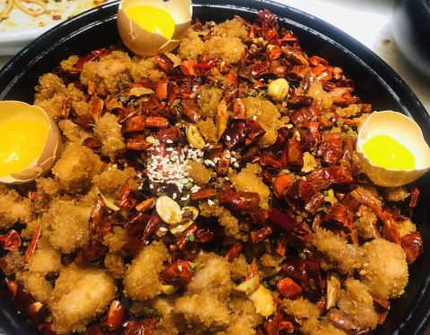 - ...直以为这道菜会比较甜,结果上来的时候是微甜中带着一点点辣,口味不错的,虾的个头真的是超级无敌大