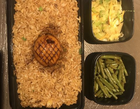 一个人吃,就点了鲍鱼炒饭。图片上有两个鲍鱼,实际只有一个,而且奇怪的是堂吃的端上来也是塑料打包盒包装的,不知为何。炒饭的量很大,也很油,因此配的两个小菜尽管有些辣,但正好解腻,所以也吃了不少,但最终都没吃完。