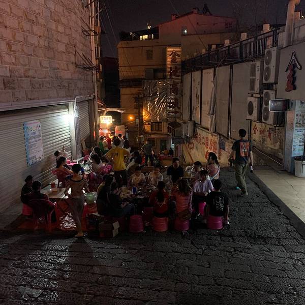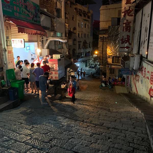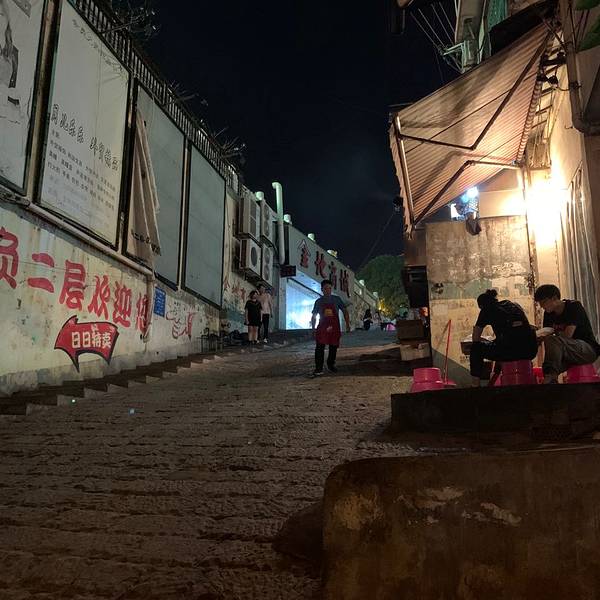 跟着烧烤美食纪录片《人生一串》来打卡的烧烤店。对于烤猪眼睛这种黑暗料理心之神往,来百色玩忍不住要尝试一番。需要注意的是,三口井头一家烧烤和萍姐烧烤其实是一家店不同的两个名字。 他家位于三口井老街上,店门口是非常陡峭的斜坡,不允许车辆通过,而且路面上的石头已经历了不知多少年的风雨,被磨得油光锃亮,一定要小心不要滑倒,特别是留意同行的小孩子。 奇怪的是,做烧烤的都是女性,男性反而在一边记账和招呼客人,这点挺独特。(隔壁店也是这样) 晚上7点半到店,看菜现点,猪眼睛几乎是每桌客人必点的菜品,怀着好奇心,我又加了一串猪鞭。值得一提的是,隔山是特色烧烤菜品。(自己搜索了一下,隔山是连接猪的肝和肺的一块瘦肉,百色人吃烧烤真是太讲究了。)由于在我前面已经有将近10位客人点的餐,等了半小时才上齐。 初次吃百色的烧烤,口味偏甜,有点东北烧烤的感觉。 重点说下猪眼睛:从背面看,看不出有什么异样,但是一翻过来,就能看到黑黑的眼球和周围的白色眼部肌肉,确实挺吓人的。吃这东西真的需要胆量!想着已经夸下海口,今天一定要吃下去,只能装作若无其事的样子,淡定再淡定。吃猪眼睛的时机很重要,太早了会很烫。太晚了食物冷却后,眼睛又嚼不动,没法吃了,时机把握很重要。放在嘴里用坐牙咬爆眼球的一瞬间,感觉汁水充满口腔,还有点怕怕的。接下来就把它当作普通的猪肉来吃,很劲道弹牙,也没觉得有什么异常。 猪鞭细细的,环绕在竹签上几圈,吃起来偏硬,需要多咀嚼一下。