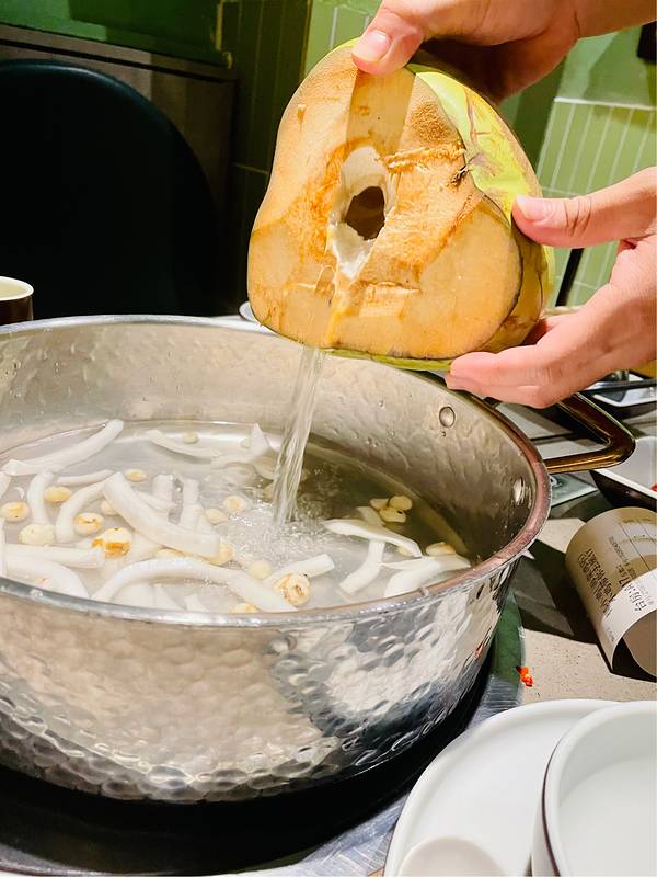 整个锅里的汤底用的都是椰子水,椰子的清香融入鸡汤,喝一口汤入口回甘。
