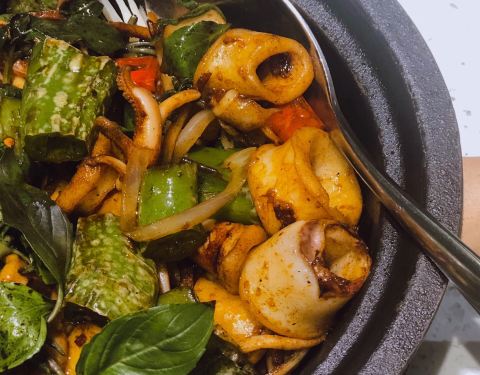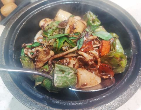 我居然第一次觉得这种做法完爆白灼,九层塔独特的香气加上青椒的辣,即使是酱爆做法也掩盖不了新鲜鱿鱼的脆