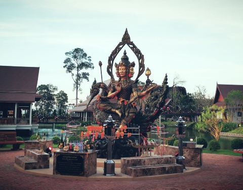 耗资40亿泰铢的芭缇雅暹罗传奇主题公园(The Siam Legend),共分Siam Vilize(暹罗文明风尚)、Thai Araya(泰国文明 ) 、Bhumi Pan Din(国家荣耀)三大奇幻主题区。可以通过这个气势恢宏的“文化之窗”,来了解古暹罗(泰国)之美。 广场的泰拳表演很精彩,想不到连一向坐不住的孩子们都被深深吸引了。 暹罗传奇主题公园(The Siam Legend) 门票:450泰铢 开放时间:10:00~22:00 地址:Sukhumvit Road (162 km marker), Na Jom Tien sub-district, Sattahib district, Chonburi 推荐理由:可以通过主题乐园的近距离体验,迅速了解泰国历史与文化,读懂泰国之美。 交通攻略: 这里距离芭缇雅约20公里,可打车或从芭缇雅乘坐景点接送车前往。 实用tips: 1、在这里可租用泰服,在园区内任意拍照,一下穿越回古暹罗文明。喜欢特写的小仙女们不能错过了。 2、大门的守护神是“罗波那”和“沙哈斯德查”夜叉神,日夜守护着暹罗。其实大家在泰国许多景点,包括机场内都能看到这两尊守护神。据说这里的两尊神像,也是目前全世界最大的“罗波那”和“沙哈斯德查”。 3、园区除了配备能讲中文的服务生,园内三语路标就是泰文、中文、和英文,这些细节均反映了对中国人的极大友善。 4、因陀罗神像的两侧有两间主题水果屋,从芒果糯米饭到各种经典榴莲拼盘,再到榴莲芝士蛋糕,应有尽有,榴莲控千万别放过榴莲冰沙!100泰铢一大杯! 5、『暹罗传奇』史无前例地通过艺术、传统、建筑、手工技艺和生活方式,全方位再现古暹罗各时期的传奇,并将之打造为泰国的又一网红地标。 有趣的灵魂在跳舞,我有我的态度。