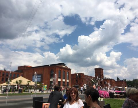 建筑新旧交互,广场非常漂亮,有很多鲜花、喷泉,游乐场,人们坐在餐厅外面,边吃边喝边欣赏街景,很是惬意