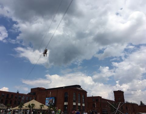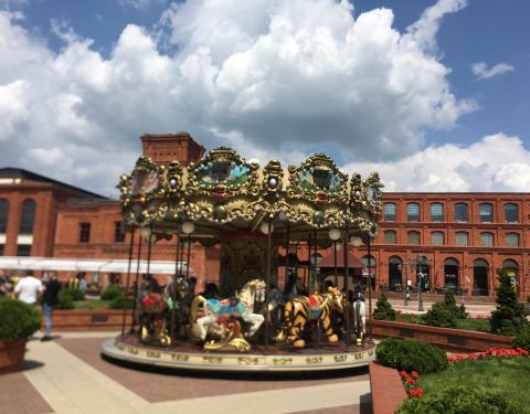 很大的购物区,建筑新旧交互,广场非常漂亮,有很多鲜花、喷泉,游乐场,人们坐在餐厅外面,边吃边喝边欣赏街景,很是惬意。
