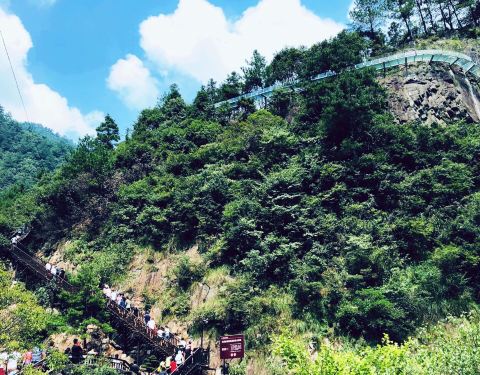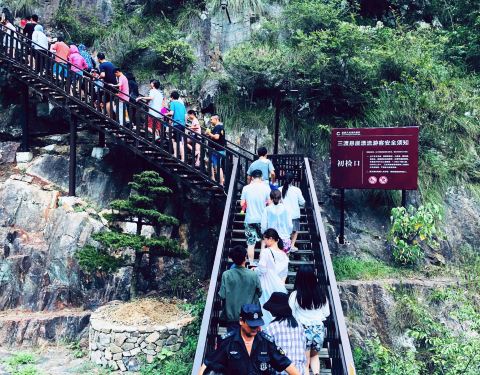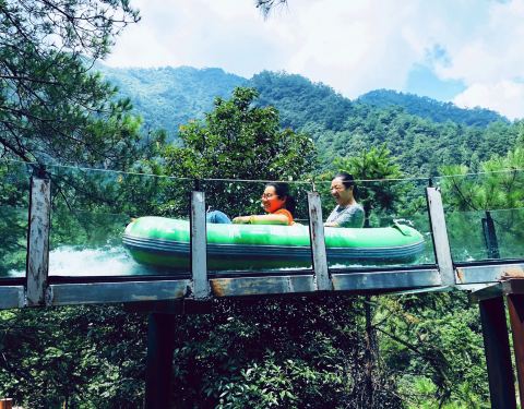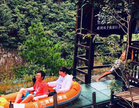 杭州三渡悬崖漂流景点攻略 来到杭州游玩的游客有机会一定要去临安区龙岗镇的三渡悬崖漂流景点体验一下!它是全国首条建在悬崖上的玻璃漂流,全视野透明设计, 360°双层环形盘旋。 1、交通:由于景区较为偏远,建议自驾。从杭州出发,自驾约2小时抵达龙岗镇的浙西大龙湾。可以开车直接到三渡悬崖漂流景点下的停车场,也可以把车停在游客服务中心停车场(收费10元),然后坐景区的中巴车去景区,车行约10分钟左右。 2、门票:180元每人,在游客中心购票包含景区中巴车的费用。也可以在网上平台订票,优惠30元左右,然后一定要到浙西大龙湾游客服务中心自助服务机上取票! 3、玩法:60岁以上老人和有心脏病史者、1米3以下孩子都不能玩此项目! (1)建议穿束口的冲锋衣和凉鞋,因为漂流时,橡皮艇撞击两边的玻璃护栏时会溅起许多水进入橡皮艇中,如果只穿日常衣服,肯定湿身,而且是湿透的那种状态!也有人买雨衣,但橡皮艇里都是飞溅入的水,坐上面照样裤子会湿透! (2)手机一定要套防水袋,否则手机泡水损失可就大了! (3)乘坐橡皮艇需要先登百米左右高的山,而且节假日期间要做好长时间排队的思想准备!全程漂流时间约5分钟左右! 4、推荐理由:三渡悬崖漂流依山的岩壁而建,蜿蜒起伏,好像一条巨龙盘踞于峡谷之中,漂流全长1公里,首尾落差68米,从山巅俯冲直下,沿途峡谷风光尽收眼底,让你肾上腺素飙升,充分体验到逐浪山巅的惊险与刺激!