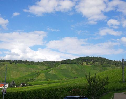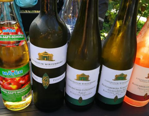 Frank总共拿了五瓶酒,我们一行坐在室外阳台,边喝酒边观赏葡萄山谷的美丽景色,这次中间那瓶红白葡萄混榨的Gemischter Satz实在精彩,下次来要带上几瓶回家。周末来得晚的好处是客人不多,不会找不到座位,但是庄主下午4点就关店走人了,客人要坐在室外阳台自助服务,喝完将酒瓶放置在指定地方,麻烦点的就是没有洗手间可用了,只能回城路上经过奔驰博物馆去上洗手间,顺便也让Frank展示一下他老东家的辉煌历史。斯图加特周围的山头小镇上有不少这样的酒庄,选个合适的喝点当地葡萄酒,吃上一顿大餐,顺便望望山坡下斯图加特市中心的景色,特别是晚景,斯图加特火车站上面那个闪闪发光的奔驰标志,还是让人心情舒畅。Rotenberg小镇上的这些酒庄真是很好的下午茶、晚餐选择地,这家Collegium Wirtemberg酒庄景色真的不错,酒更好