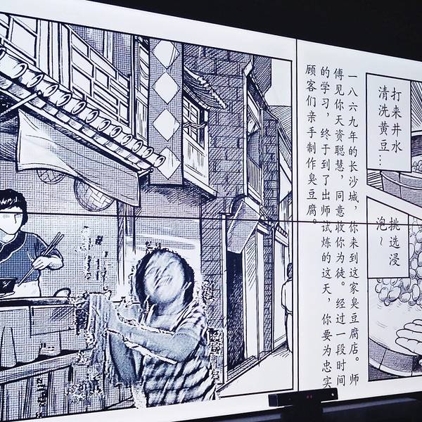 那感觉,真是让人无比上头,整整10分钟都没有缓过神来。如果大家来博物馆游玩的话一定要挑战一下,绝对是终身难忘。小朋友们和结伴前来参观的朋友们喜欢在门口大娃娃处和娃娃墙这两个地方合照。听工作人员讲解说,这个娃娃叫臭仔,是臭豆腐博物馆的ip形象。能感觉到老板的用心,想通过这个形象给游客亲切的感觉。博物馆最吸引我的体验项目是“臭豆腐漫画制作”,站在电子屏面前互动就能制作属于自己的臭豆腐漫画。没想到有一天,自己也能成为漫画主角,这种感觉还是挺有意思的。全部设备体验完后就可以吃吃吃,买买买啦!