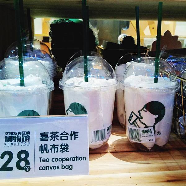 这家博物馆的特产区超级有意思,所有包装上都有臭仔形象。卖的东西也很特别,除了常规特色糕点之外还有方便臭豆腐、臭气罐头。老板很用心,还在方便臭豆度售卖区旁边贴上了“食用小贴士”。臭气罐头可以买回去给亲人和朋友闻。这么“上头”的味道当然不能一个人享受!逛着逛着,我发现了一个必须要买回家的东西,那就是喜茶和文和友合作的帆布袋。帆布袋被装在奶茶杯里,售卖形式很新潮。没想到臭豆腐和奶茶也可以玩联名,长见识了!这里的臭豆腐和外面不太一样,不是传统的酱料臭豆腐,而是有酸辣鱿鱼、辣椒炒肉、口味鸡、麻辣小龙虾四种口味的盖码。一份四片臭豆腐,可以全部点同一种盖码,也可以像我一样,每种盖码来一片。