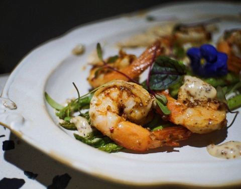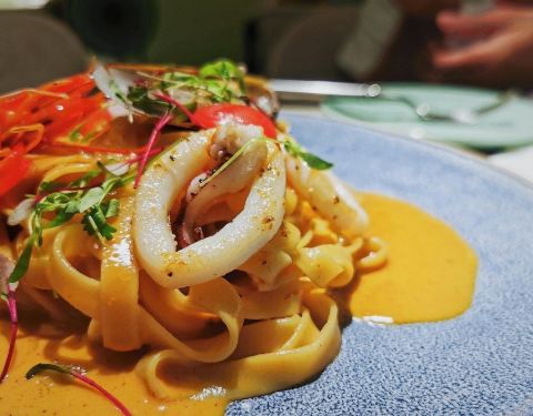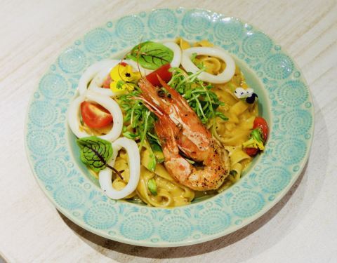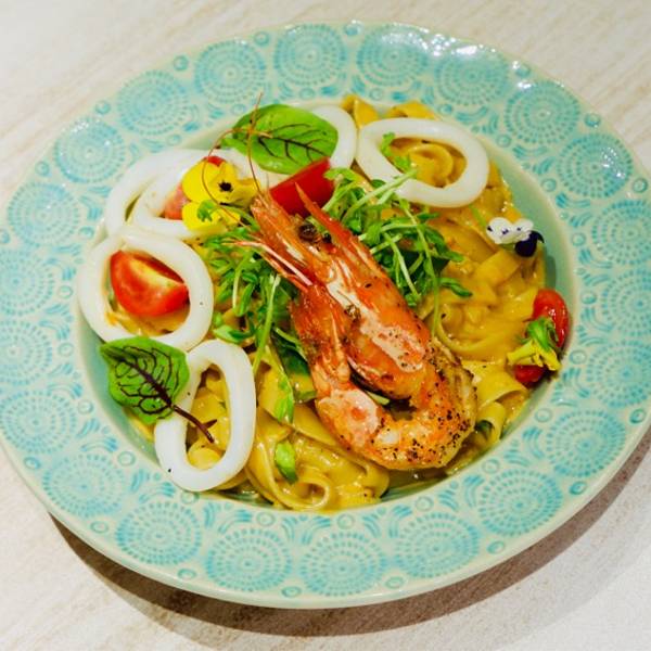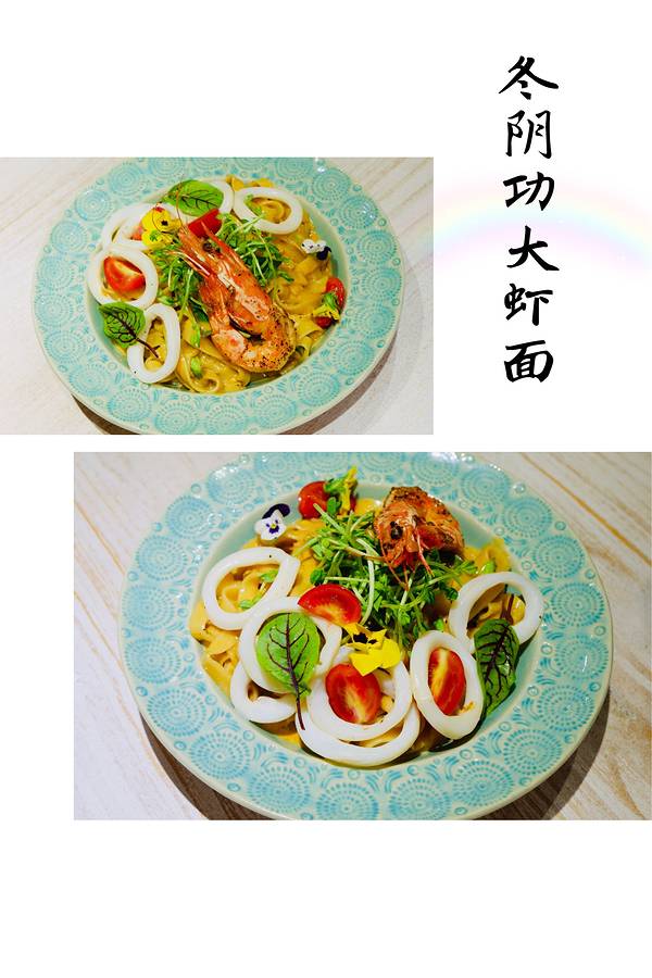 创意西餐非常有趣,很多菜品都有主厨自己的见解和创意,如果你吃腻了千篇一律的西餐,那么这家推荐给你。 蓝白色调的装修风格非常舒服仿佛希腊的圣托里尼,二楼还有靠窗的小天地。阳光、美食和懒人沙发让你肆意享受慵懒的午后时光。 大鸡腿 切开就是纯腿肉,吃起来很方便,鸡腿肉非常鲜嫩多汁,而且很入味并不会寡淡,必点! 小汉堡 真的是mini汉堡,但用料很实在虽然小但厚实,生菜和西红柿很好的中和了肉饼的油腻感,面包很酥软。 冬阴功意面 一开始点了一份调味有点不均反馈意见之后马上又给我们换了一份,这个服务我觉得可以。第一次吃冬阴功味的意面,我个人本来是对冬阴功不太感冒的,但这份意面让我爱上了哈哈哈!入口先是酸辣后劲有泰式香料的清香,整个口感层次很丰富而且宽面处理的软硬适中,推荐! 鲜虾披萨 品品这个优秀的拉丝!罗勒酱+鲜虾+芝士+酥脆披萨饼,完美组合,除了罗勒酱有点偏咸以外都很棒。 蒜香虾佐黄油芦笋 不知道是主厨喝爱虾还是我很爱虾,在这家餐厅吃了很多虾哈哈哈!这道感觉上是中西合璧,虾很优秀芦笋有点点苦。 蘑菇汤 料很足!蘑菇味很够!蘑菇爱好者的快乐!就算冷掉了也很好喝的汤品。