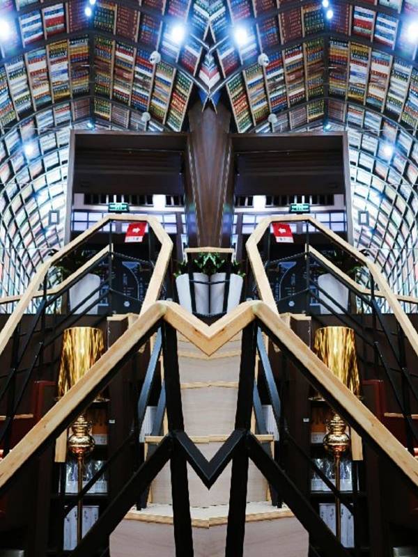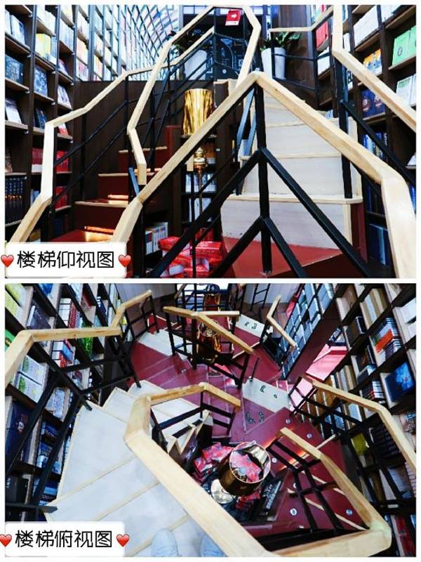 融科店就是“京味儿”钟书阁。坐扶梯来到融科资讯中心B2层,眼前是喷泉小桥。右边,黑底金字、隶书体的钟书阁牌匾并不张扬。进入书店,仿佛来到魔法世界:镜面屋顶让书架虚实交错,目光所及到处都是书,人仿佛进入书的殿堂。迎面是通往二楼的楼梯,楼梯间是整个融科店设计的最大亮点所在:楼梯宽度差不多仅容一人通过,曲折陡峭,几乎每三两级台阶就要转折一下,因为镜像的缘故,楼梯周围几乎360度都是书架。走到楼梯尽头回望,书架和楼梯围裹出的平面恰如一个中国结。