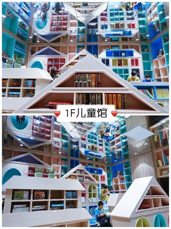 一层楼梯间右侧是儿童馆,一层层小木屋书架好像北京四合院的门楼,每一座木屋书架后还设置了一组卡座,孩子们可以席地而坐阅读自己喜欢的图书。七巧板图案组成的墙面书架、斑斓缤纷的色彩,都让儿童馆充满童趣。