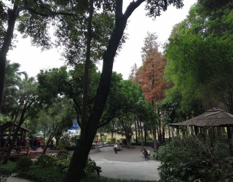 粤秀园是天河公园里比较大的一个园林,几座木亭处于丛林之中。