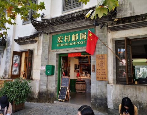 白墙黑瓦倒映,小桥流水行云。宏村南湖畔,走过画桥边,来到画里乡村——黟县宏村景区内,四个绿底金字“宏村邮局”镶嵌在典雅的徽派建筑上。墙上一块木板雕刻着“停下来,看风景。”邮局内清香新茶、醇香咖啡充盈室内,有新意的文创产品和徽州特色产品琳琅满目。宏村邮局·与山悟趣大概就是这样一个存在,一个细细欣赏徽州的窗口,让你更多地阅读徽州、认识徽州、感受徽州。