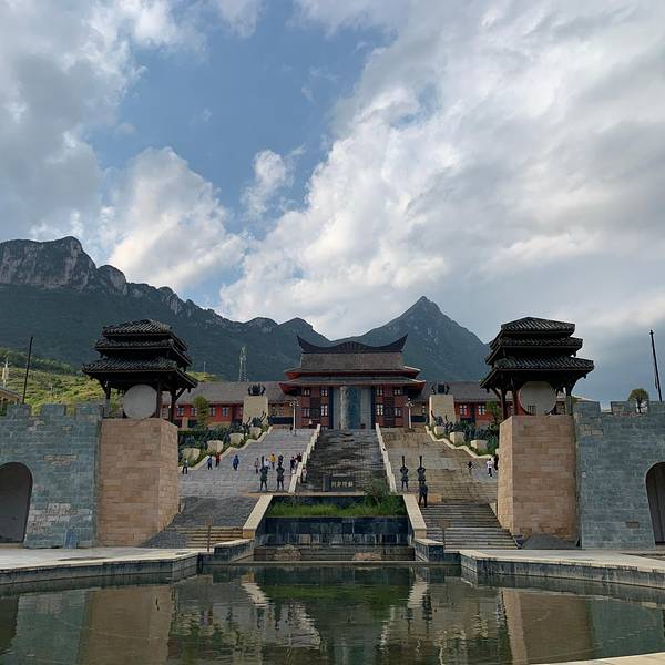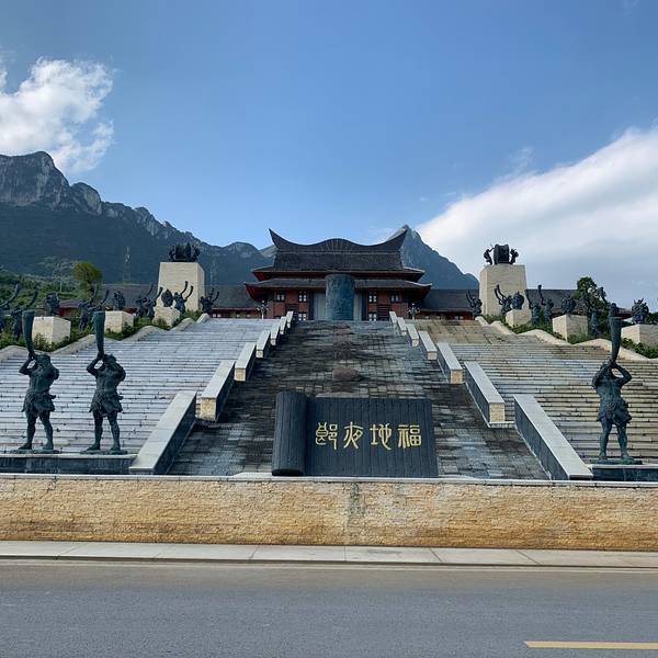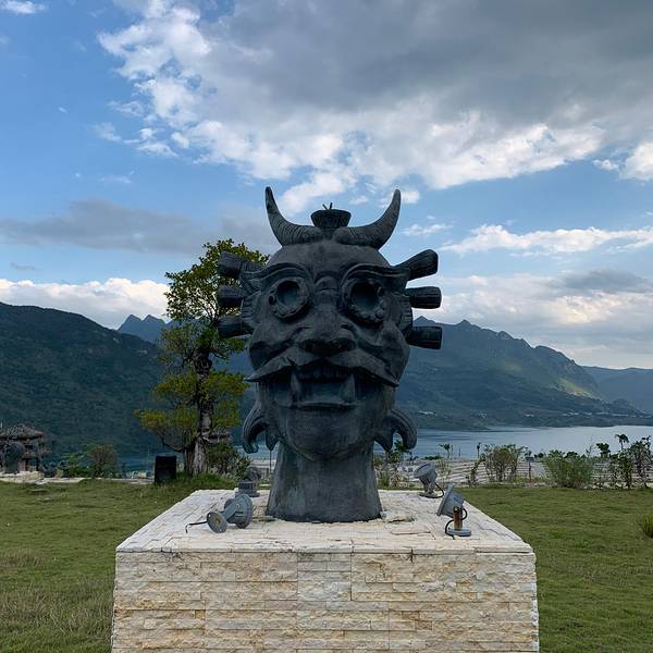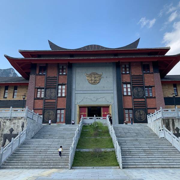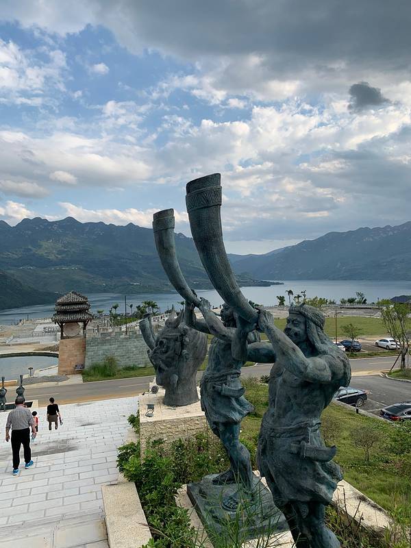 牂(zang第一声)牁江夜郎王宫位于钓鱼圣地——毛口,此地夏天比最近的城区六枝城区的气温要高出5度,其地理位置三面环山,面临宽阔的牂牁江,景色十分壮观!让人赞叹!从山顶可以直接看到牂牁江,看上去很近,但是要开车下到离江边不远的夜郎王宫还需要10余公里的路程,半小时的盘山公路开到让人眩晕。 个人觉得夜郎王宫的外面比房子里面好看,王宫里需要购票才能进入,但是很多展品都是照片和复制品,原物非常地少,而且内容不多,即使像我这样一字不漏地仔细去看,一小时都能看完,不值得购票进入。但是外面的广场和建筑很有特色,人造景观充分体现了夜郎国的神秘、原始与粗犷。最好看的是青铜的塑像,很有质感,很有沧桑感!还看到有游客把房车开到夜郎王宫的停车场内驻扎,蓝天、白云、河水、陡峭的大山,完美的举家休闲度假胜地。