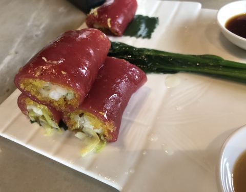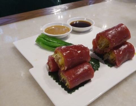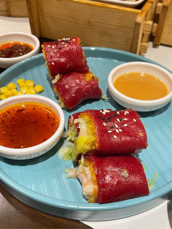 💘六运特色有机肠:强烈推荐!肠衣软糯,虾肉大颗很弹,包裹的炸物油香油香的,上面的水果酱增加了一些水果香。一大口咬下去,口感层次太丰富!!配了两种蘸酱:酱油和花生酱,推荐酱油,提鲜!四川口味实在不喜欢花生这种腻腻的口味的(吃多了会有点油腻,不过都吃粤菜了,还怕什么油腻?)