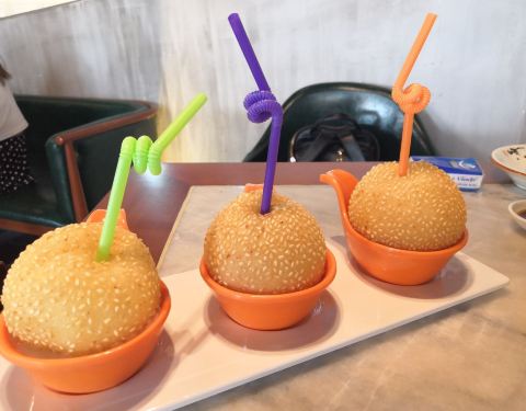 💘禄禄椰汁金秋:一般!被图片欺骗的菜!怎么说呢,就是我们四川的麻圆儿君本人啊,只是做大一倍再钻个洞,加上椰奶汁。成了一道新式改良菜,外壁厚厚的麻圆儿还是蛮香的,不过吃完其它的真的腻得吃不下了,椰奶汁还不错。
