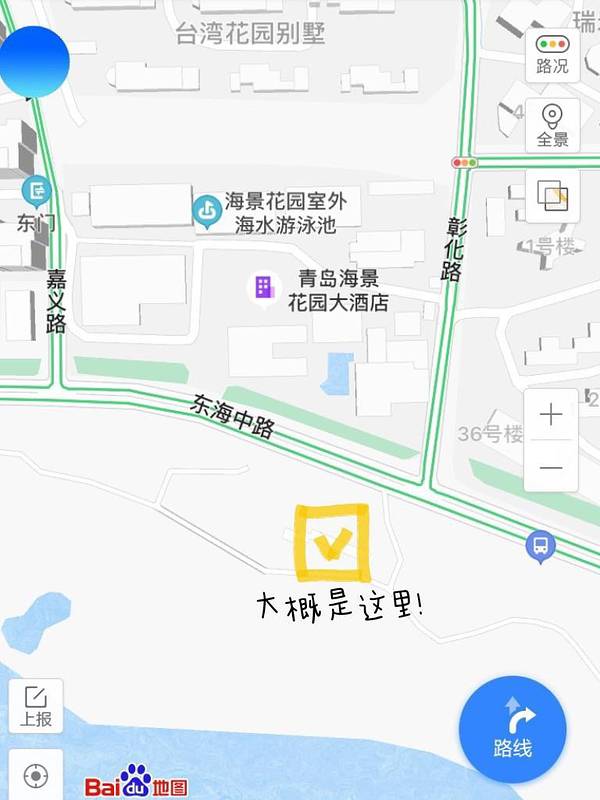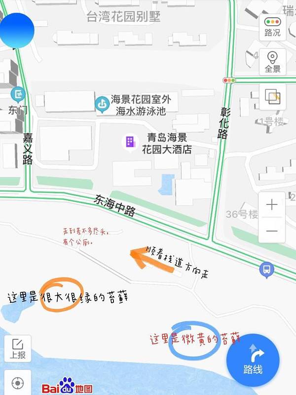 地图搜索【海景花园酒店】,然后往大海的方向走,在栈道上。