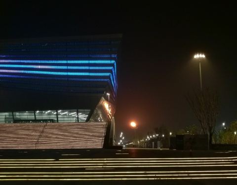 郑州奥林匹克体育中心完全是一个新建的设施,他就是为了迎接全国少数民族运动会而建成的,虽然位于郑州的大西边,但是交通还是非常方便,坐公交车的话有12路,210路等线路到达,坐地铁的话,郑州地铁14号线也通到了这里。本想着借着少数民族运动会的时间来这里打卡一下,但是在奥体中心附近围满了围栏。虽然不能近距离的接触奥体中心,但是在远观拍他的夜景也是格外的美,LED显示屏上不断的打出各种各样的形状,让你拍的应接不暇。
