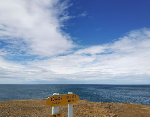 下车后需要步行十五分钟左右,就看到那个一边指着赤道一边指着南极的路标。狂野的怪风吹到人都不能站直,戴帽子的要留意帽子,长头发的最好扎起来。 景色绝美,值得一去。