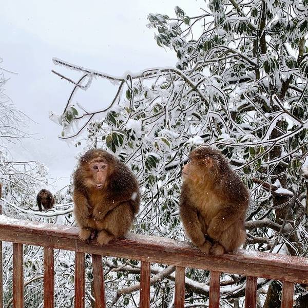 住在雅女湖边的温泉酒店, 头天晚上雾气腾腾泡个热水澡, 按老板说的早上六点半起床,七点钟吃早餐。大约半个小时就到了瓦屋山,上山不排队。雅女湖到瓦屋山,一路都在飘着零星小雨,温度从4度直接下降到0度。 网上购的套票198元,直接刷身份证进山门。坐第一段缆车上山,小雨渐渐变成天上飘着小雪,脚下的道路和山上的树木隐约有白色的积雪。缆车终点可以看到很多野生猴子,大大小小的,在路边找游人要吃的,适合拍照打卡。 这时地面已经铺了厚厚的一层雪了, 有些雪被踩硬了,还有点滑。 初见那么多雪,人是激动的,也不觉得冷,大家拿出了玩雪的装备,铲雪、滑雪· 一路上行,有很多卖吃的。 价格都不是很贵,方便面十块,烤肠十块。瓦屋山最好的一点,是随处提供免费的热水,有很多人自带方便面上去,简单就解决了一顿。这点我觉得比其他景区都好很多。