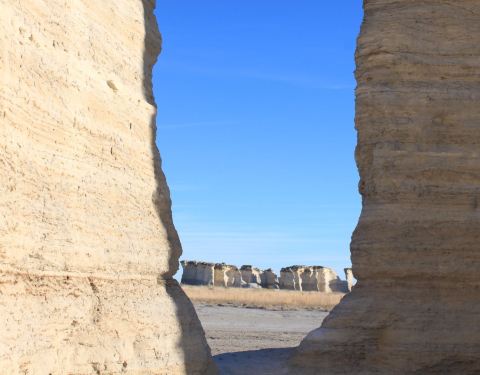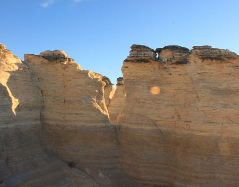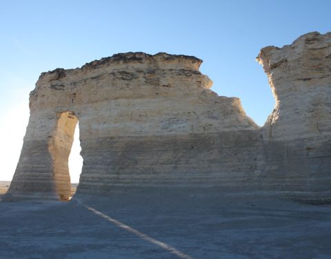 monument rocks 纪念碑岩位于堪萨斯州西部的威奇托和科罗拉多州的丹佛之间。白垩纪岩层,多化石,美国第一个国家自然地标。在堪萨斯西部大平原上突兀着这样一片大拱门型岩石确实非常壮观,特别是在早晚,太阳斜射穿过园拱门,非常漂亮。也是由于位置偏僻,游客稀少。