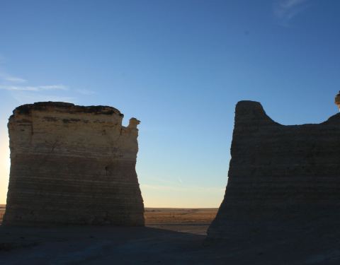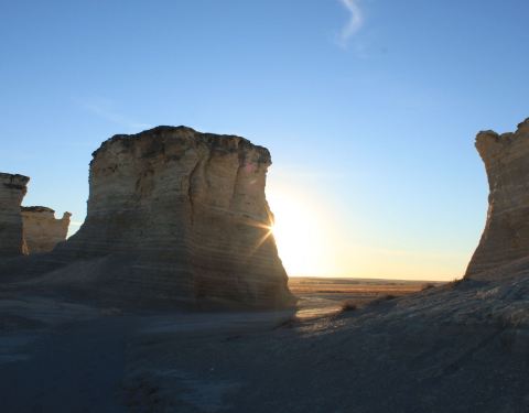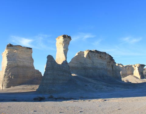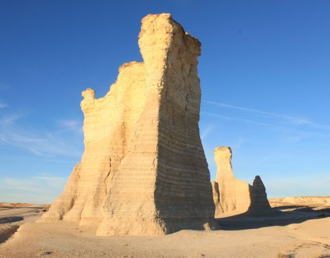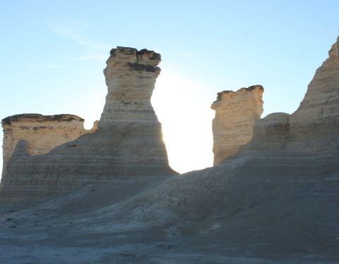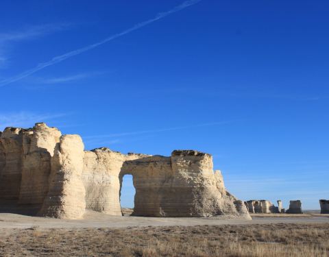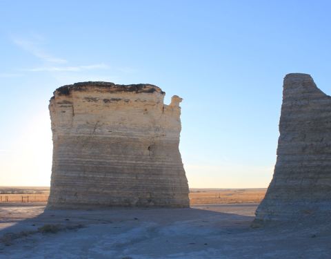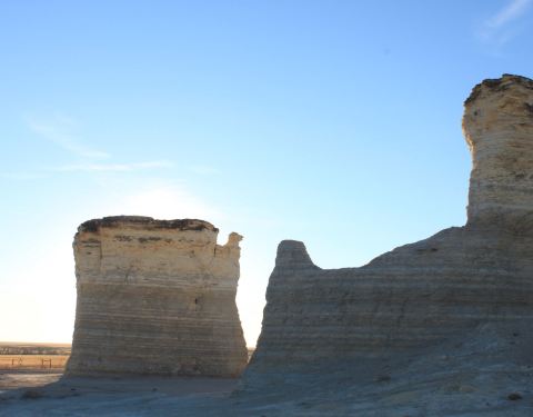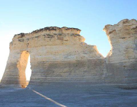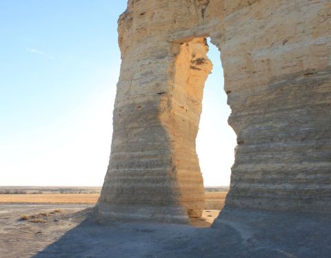 monument rocks 纪念碑岩位于堪萨斯州西部的威奇托和科罗拉多州的丹佛之间。白垩纪岩层,多化石,美国第一个国家自然地标。在堪萨斯西部大平原上突兀着这样一片大拱门型岩石确实非常壮观,特别是在早晚,太阳斜射...