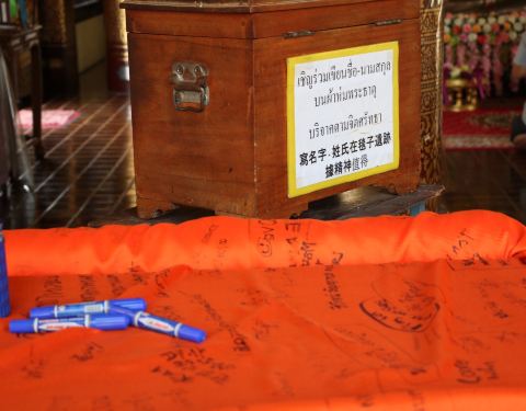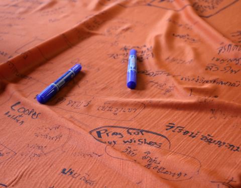 偶遇一当地居民,在红布上写字,我一边观看,他说泰语并挥手邀请我也去写上,面带笑意,很是温暖