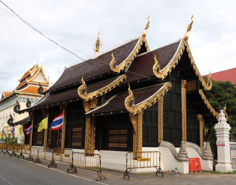 这是一座寺庙,有一个非常有趣的传说。据说有一天,门格莱王到这个地方去打猎。他看见一对白鹿在驱赶一大群野狗。他认为这是一个不祥的征兆,决定在这里建造一座新城市,并在这里竖立了城市支柱或因塔印柱。因此,这座寺庙被称为英刹钦寺或城市的肚脐寺庙。这是一座用深色柚木建成的奇特的小寺庙。它有金色的装饰,庭院有美丽的小雕像。这里在三王纪念碑和兰纳博物馆附近,这座非常适合拍照的寺庙恰好坐落于一段马路边,使得它格外突出现眼。寺庙几乎全是黑色,镶了金边,很好拍照。这里非常小,所以里面空间狭窄,但仍然很有趣,很上镜。这里曾是城市支柱——因塔印城柱的所在地,但现在它搬到了契迪龙寺,步行过去只有5分钟。你到镇上的这个区域的话,一定要去看看。