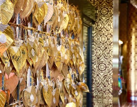 可不能小瞧了这座寺庙,据说已有数百年历史,跟清迈建城的历史一样悠久。现在是免费的,不属于重点旅游景观。旁边就是清迈的几个博物馆,和三王纪念碑。 整体外观还是兰纳风格,但屋顶呈黑色,金色包边,显得格外醒目!大殿外双龙守护,白色主体,可爱的是周围还有一圈憨态可掬的小和尚泥塑。 这儿的塔不是白色,不是金色,就是红砖垒砌的塔,外面裹着一层红布。 大殿内供奉着佛像,虽然面积小,但还是金碧辉煌。尤其是黄金叶模样的许愿牌,金光闪闪。还准备了一块红布,信徒可以把自己的名字写上去,求菩萨保佑。 游客很少,跟别的小庙一样,拖鞋进去之后我在这里静坐三分钟。偶遇一当地居民,在红布上写字,我一边观看,他说泰语并挥手邀请我也去写上,面带笑意,很是温暖。