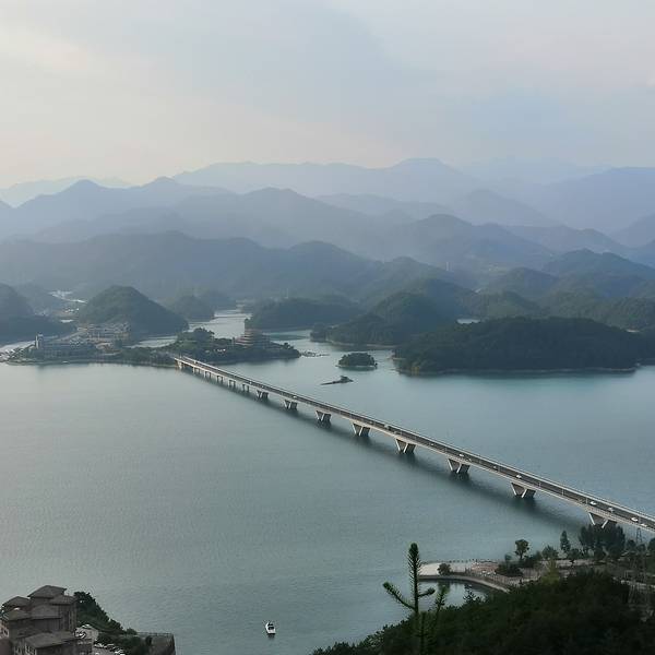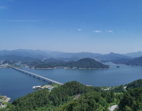 登上天屿山观景台一览千岛湖好大一片湖区美景,横卧在山水之间的千岛湖大桥,似一根银链将两地美景连接。