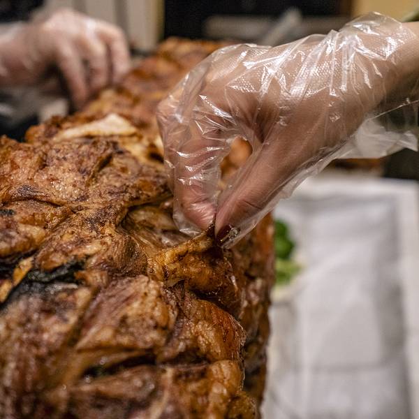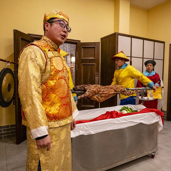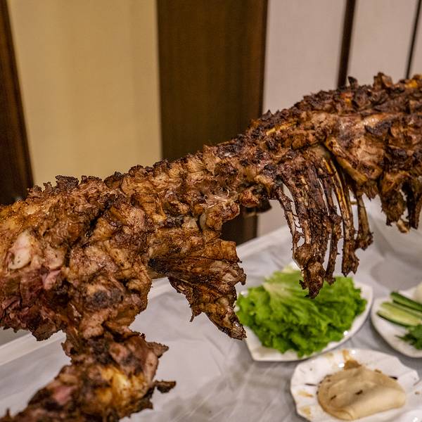 其中绝对不容错过的就是烤全羊!不过能全程吃完六道的,应该都是大胃王了看完大秀也差不多到了晚餐时间,中国马镇有一条美食街,什么“满族八大碗”,什么铜锅涮肉麻辣烫应有尽有,就连KTV和酒吧、书吧都一应俱全。其中绝对不容错过的就是烤全羊!在中国马镇的美食街,有一家“天下第一...看完大秀也差不多到了晚餐时间,中国马镇有一条美食街,什么“满族八大碗”,什么铜锅涮肉麻辣烫应有尽有,就连KTV和酒吧、书吧都一应俱全。其中绝对不容错过的就是烤全羊!在中国马镇的美食街,有一家“天下第一烤羊”,烤羊地道不说,还有“贝勒爷”亲自致辞祝酒,可谓仪式感十足。在中国马镇的烤全羊是鲜羊现烤,中国马镇的烤羊可是自有一套吃法——讲究的是“六吃”,一吃皮,二吃肉,三吃羊排,四吃羊腿,五吃肉串,六喝汤。从羊皮开始,羊肉、羊骨、羊肉串、羊汤,层层递进。穿在架子上的烤羊也需要进进出出数次,逐次加工。每吃一道,食客们都要戴上一次性手套,围着烤羊手撕而下,其乐融融颇为热闹。不过能全程吃完六道的,应该都是大胃王了。我们要的这只羊2400多元,10多个同行的朋友一起大快朵颐都没吃完……分量是很足的哦! 展开