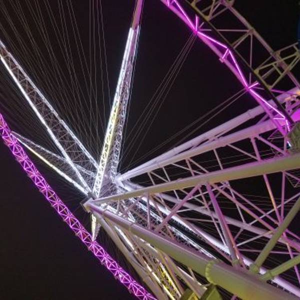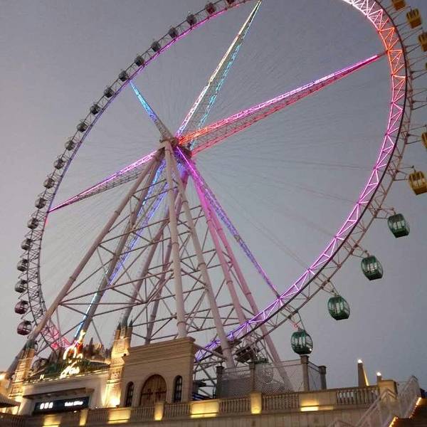 夜晚的摩天轮有彩灯很绚丽,每个摩天轮的观光都有空调,很舒适,转一周18分钟。