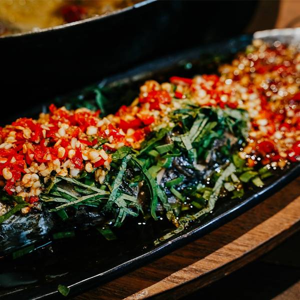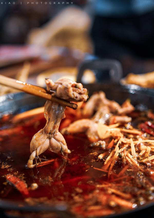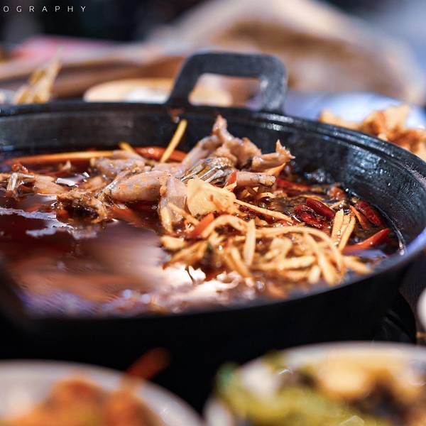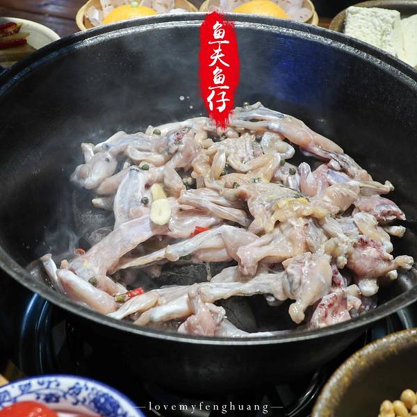 烧热300度的鹅卵石铁炉闷烧的现杀鱼蛙,定时器一响即可开锅。很有仪式感地三人抬上桌,还有开锅仪式,滋啦啦现杀下锅。 牛蛙配酸菜, 四川 本地腌制的上好酸菜店里秘制十分起鲜,用蒜泥、香菜、芹菜、葱、豆豉油...烧热300度的鹅卵石铁炉闷烧的现杀鱼蛙,定时器一响即可开锅。很有仪式感地三人抬上桌,还有开锅仪式,滋啦啦现杀下锅。 牛蛙配酸菜, 四川 本地腌制的上好酸菜店里秘制十分起鲜,用蒜泥、香菜、芹菜、葱、豆豉油、花生碎、黄豆酱碟浇酸菜原汤,汤底是酸菜配野山椒制成,辣度统一,意外的辣味后劲十足,依然忍不住使劲儿捞牛蛙,矫健的牛蛙取2两的规格最鲜嫩不散。 江团配古法红汤,牛油配青花椒,倒是意外的柔和,吃来还不上火。江团无刺,肉质紧实带皮的部分还有胶质感。 锅边围一圈木质转盘可随心搭配凉菜小食特色点心, 比如 凉拌鲫鱼、油爆河虾、小酥鱼,还有橘子馅儿的蒸包、小笼包等。吃得丰盛满足!