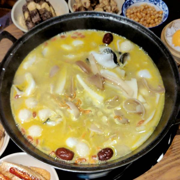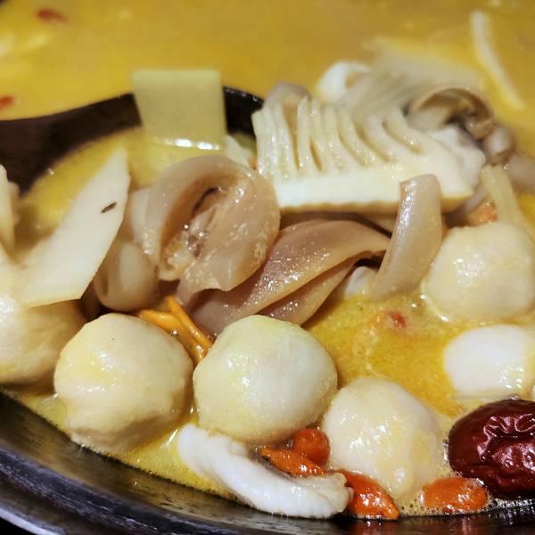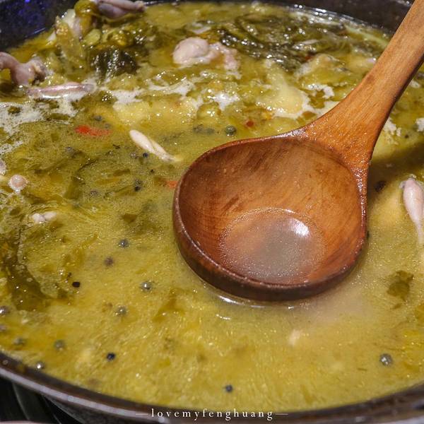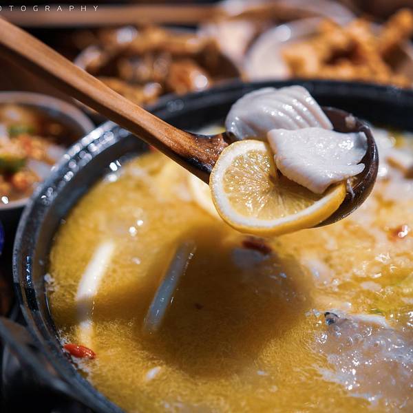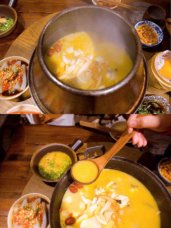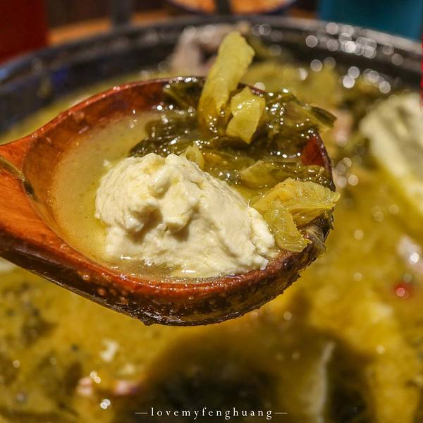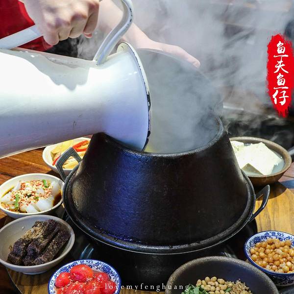 "鱼夫鱼仔"主打的锅底是经典红锅、古法酸菜锅、柠檬仔姜锅,不过如果不想吃辣或者不能吃辣的话,那"女神金汤"(¥48)绝对是首选!充满仪式感的开锅仪式