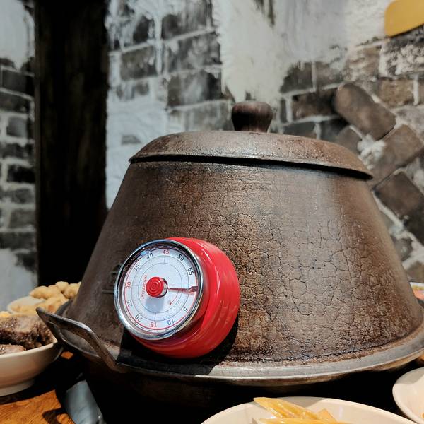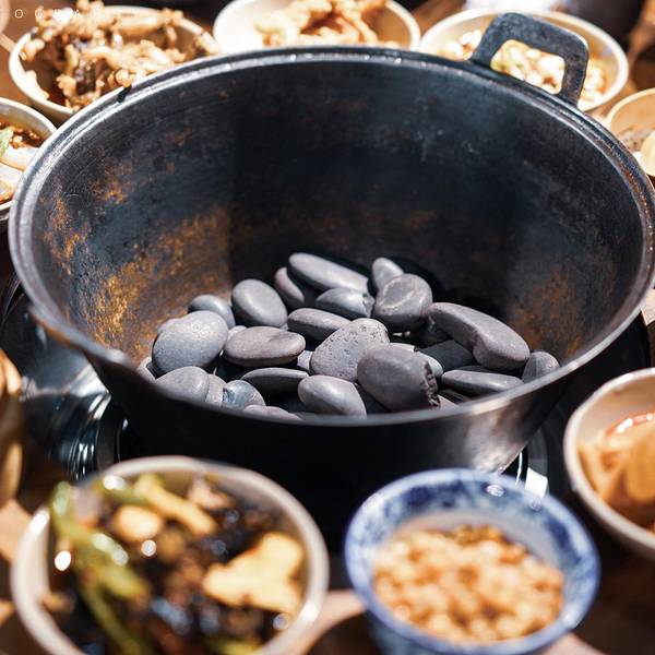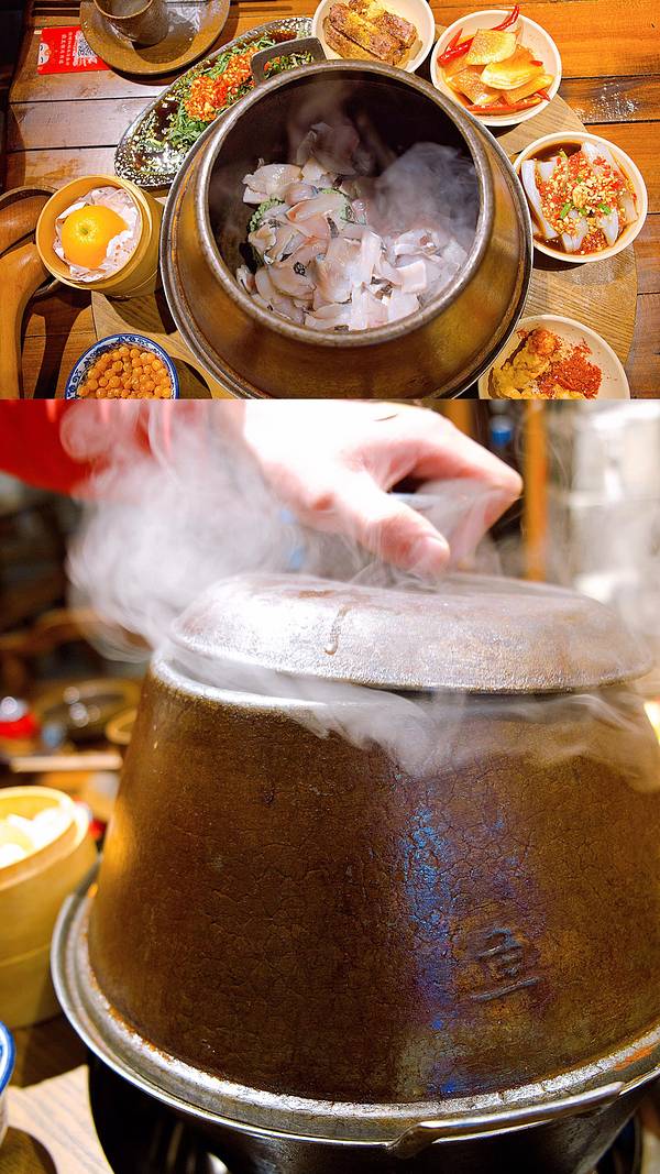 烧热300度的鹅卵石铁炉闷烧的现杀鱼蛙,定时器一响即可开锅。很有仪式感地三人抬上桌,还有开锅仪式,滋啦啦现杀下锅。 牛蛙配酸菜, 四川 本地腌制的上好酸菜店里秘制十分起鲜,用蒜泥、香菜、芹菜、葱、豆豉油...