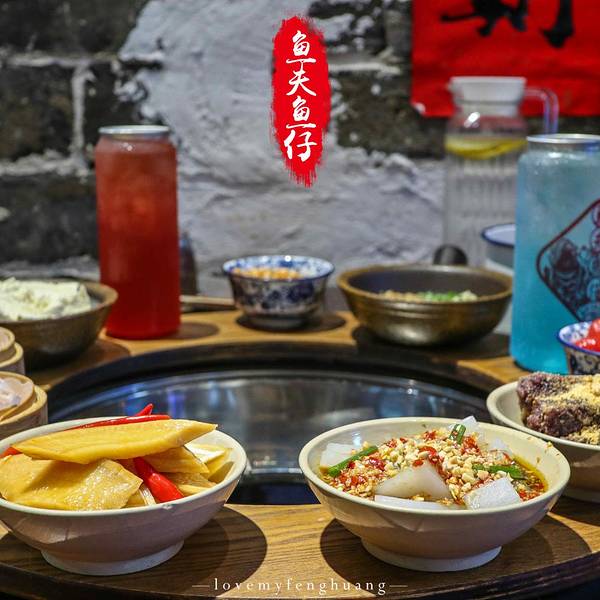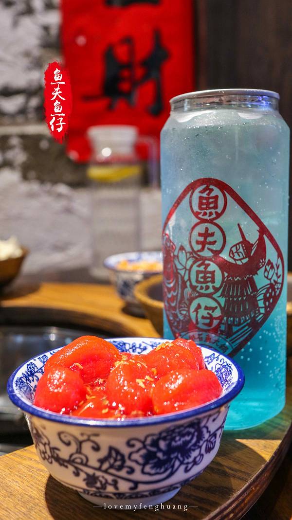 喜欢它家的装潢风格,复古怀旧风,木质的餐桌,长凳,颇有老成都的赶脚 招牌鱼火锅,当然少不了鱼,刺多的花鲢、少刺的裸斑、无刺的红砂江团罗非鱼乌鱼、只有一条主刺的三角峰。 近期上了新品,在店员推荐下,选择了古法酸菜锅搭配长腿美蛙,再点一些素菜,黑米糍粑、海天一色、秘制泡萝卜、农家土凉粉、蜜汁小番茄、豆花,这次就试试这个。 凉菜:秘制泡萝卜可以一解麻辣的油腻,农家土凉粉也很好吃小吃:我比较喜欢吃糯米的,黑米糍粑推荐,豆面和红糖缺一不可,外酥里嫩,还有橘子蒸包,软软的里面有橘子馅 饮品:颜值颇高的三款气泡果饮:橙色的柚色玫瑰、红色的莓飞色舞、蓝色的海天一色,分别是柚子味道、草莓味道、薄荷味道,吃火锅一定要搭配冷饮才够爽。 甜点:特别推荐蜜汁小番茄,之前吃过其他家的,有的番茄过大,有的做的太甜,它家的就甜度适中,还是挺好吃的,关键是甜而不腻。 将鱼或者牛蛙倒入被烧得滚烫的鹅卵石,再加入选好的锅底,圆石加热,鲜烫好汤,更能激发出食材的原汁原味,盖上锅盖,设置好计时器,等待一阵后响铃,锅内的食材就可以吃了,撇出来的头汤可以用来调料,加入了原汤的鲜味,佐料也是更有味道,不过我个人觉得汤底已经很辣了,不蘸料也很好吃,这个就依个人口味了。