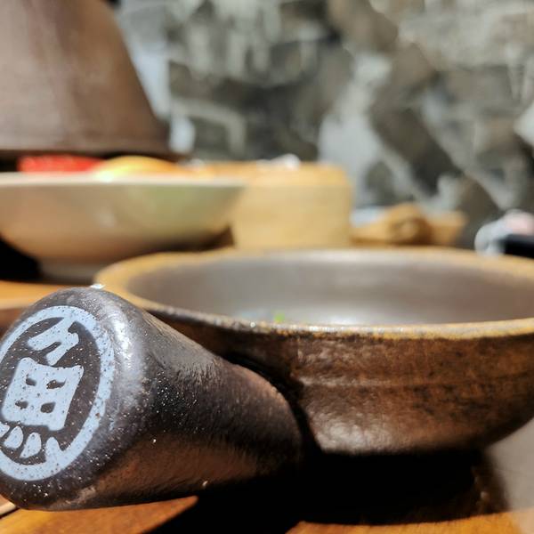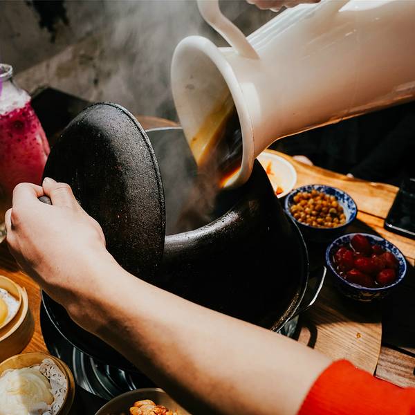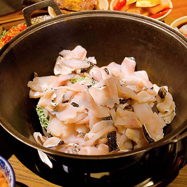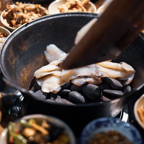 店外,能看到透明玻璃鱼缸里生龙活虎的河鲜。服务员端着印有“石来运转”的锅上来,“开锅仪式”后看到的是锅底的鹅卵石,这是鱼夫鱼仔独一无二的特色做法,鹅卵石此前在烤箱中加热到300°C,并算准妙数端上锅,鲜鱼早早被准备成厚薄均匀的鱼片待命下锅,鱼片被瞬间覆盖在鹅卵石上,发出“呲啦呲啦”的声音……哇……然后倒入秘制汤底,锅盖上有标准计时器,3分钟,一锅鲜嫩的鱼汤和鱼肉准备得妥妥。秘制的汤底有传统的红锅、酸菜锅和清新的柠檬锅底,我们吃的是传统红锅牛蛙和柠檬锅江团。