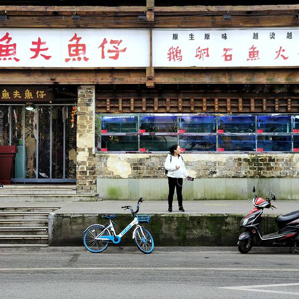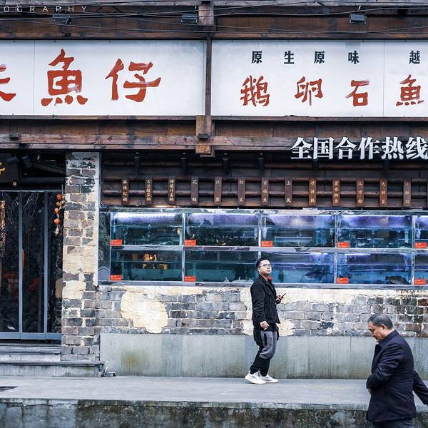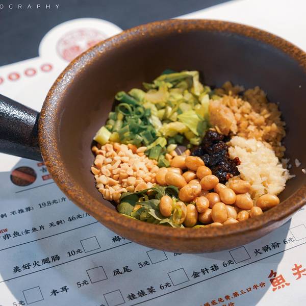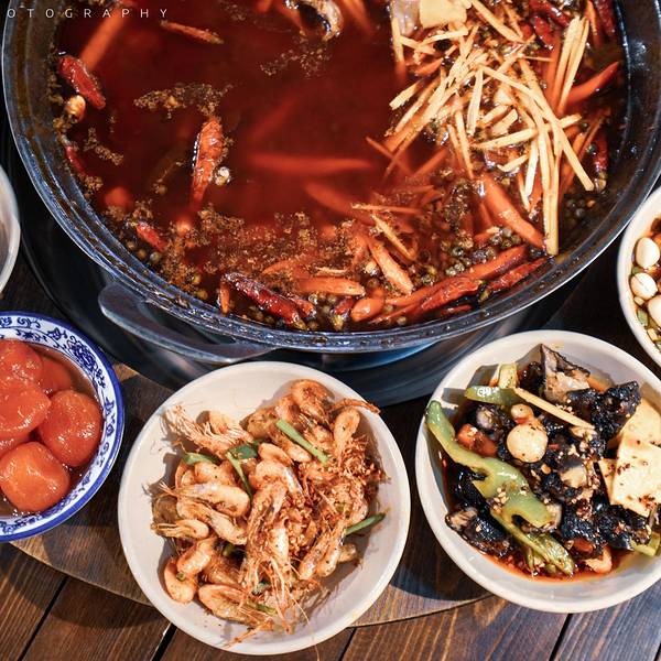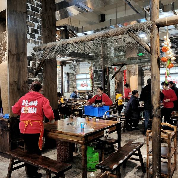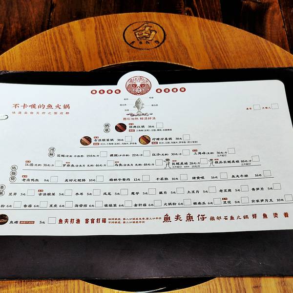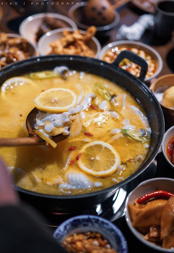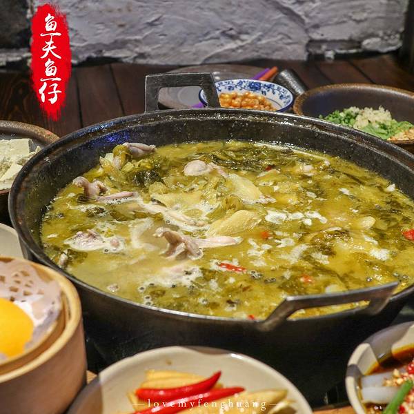 致民路是怎么来的呢?追溯到1938年,成都开辟新南门,取“致民以治”之意,有了致民路。现在你也能看到成都的“小木木”社区小公交,它从致民路的起点站开出,兜兜转转在成都的林荫中又开回致民路的终点站,仿佛老成都对致民路的特殊感情。 如今的致民路,新新旧旧,多了许多家店,但在致民路吃饭,依然有种老成都邻里街坊的感觉。店铺是浓浓渔家老屋风,木门、石墙、斗篷、蓑笠……柱子上悬挂着莲藕、小南瓜,从锅里冒出的烟氤氲在整个环境中。 店外,能看到透明玻璃鱼缸里生龙活虎的河鲜。服务员端着印有“石来运转”的锅上来,“开锅仪式”后看到的是锅底的鹅卵石,这是鱼夫鱼仔独一无二的特色做法,鹅卵石此前在烤箱中加热到300°C,并算准妙数端上锅,鲜鱼早早被准备成厚薄均匀的鱼片待命下锅,鱼片被瞬间覆盖在鹅卵石上,发出“呲啦呲啦”的声音……哇……然后倒入秘制汤底,锅盖上有标准计时器,3分钟,一锅鲜嫩的鱼汤和鱼肉准备得妥妥。秘制的汤底有传统的红锅、酸菜锅和清新的柠檬锅底,我们吃的是传统红锅牛蛙和柠檬锅江团。 除了鱼火锅,佐餐小吃也五花八门,油炸小河虾、土家小凉粉、秘制麻辣土鸡脚、橘子蒸包、小煎酥肉……▼料碟▼牛蛙红锅▼柠檬仔姜锅▼餐厅环境