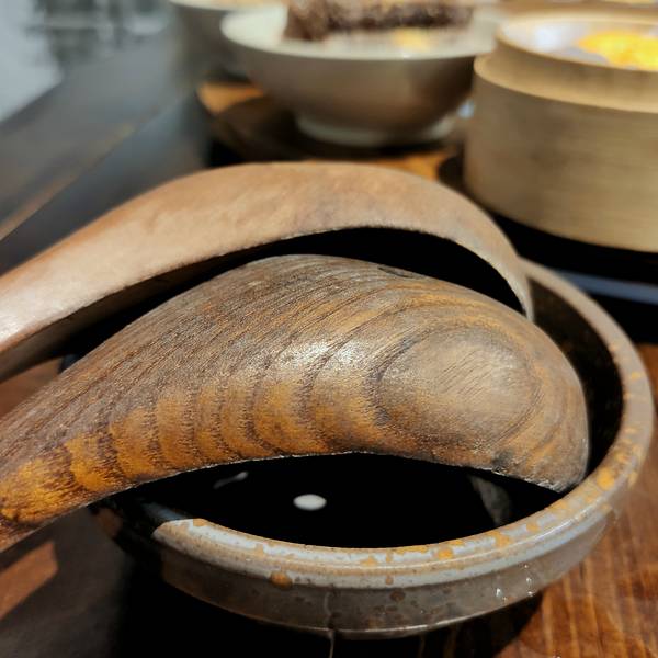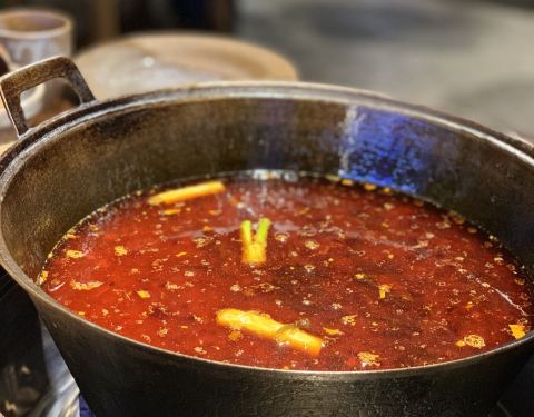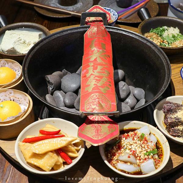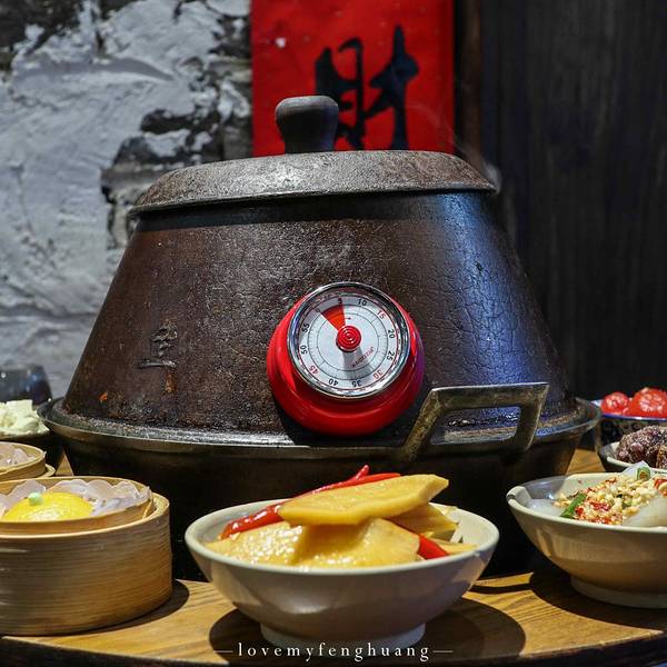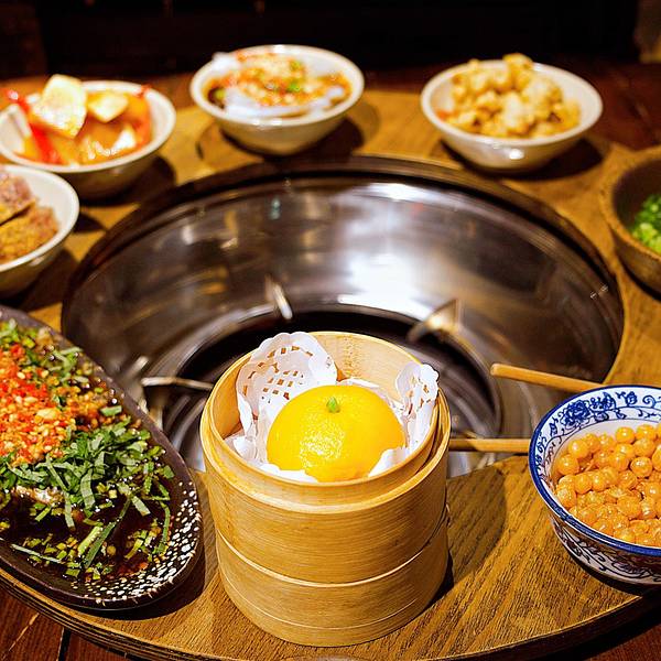 烧热300度的鹅卵石铁炉闷烧的现杀鱼蛙,定时器一响即可开锅。很有仪式感地三人抬上桌,还有开锅仪式,滋啦啦现杀下锅。 牛蛙配酸菜, 四川 本地腌制的上好酸菜店里秘制十分起鲜,用蒜泥、香菜、芹菜、葱、豆豉油、花生碎、黄豆酱碟浇酸菜原汤,汤底是酸菜配野山椒制成,辣度统一,意外的辣味后劲十足,依然忍不住使劲儿捞牛蛙,矫健的牛蛙取2两的规格最鲜嫩不散。 江团配古法红汤,牛油配青花椒,倒是意外的柔和,吃来还不上火。江团无刺,肉质紧实带皮的部分还有胶质感。 锅边围一圈木质转盘可随心搭配凉菜小食特色点心, 比如 凉拌鲫鱼、油爆河虾、小酥鱼,还有橘子馅儿的蒸包、小笼包等。吃得丰盛满足!