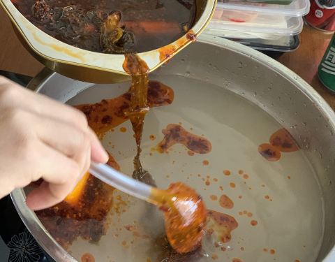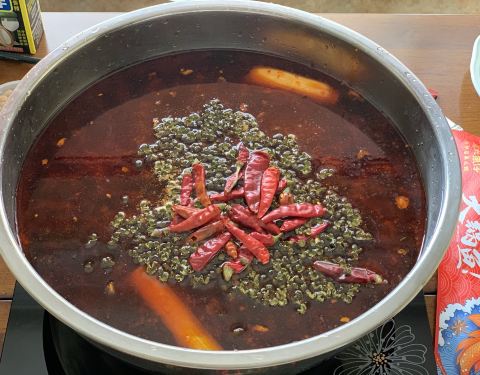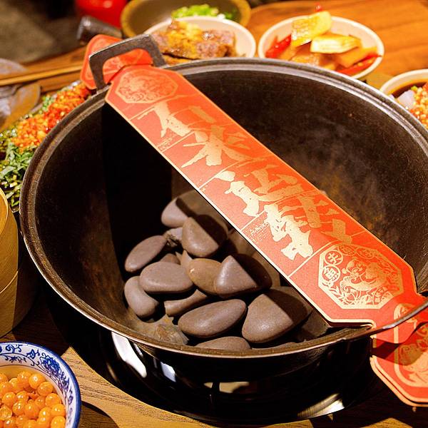 将鱼或者牛蛙倒入被烧得滚烫的鹅卵石,再加入选好的锅底,圆石加热,鲜烫好汤,更能激发出食材的原汁原味,盖上锅盖,设置好计时器,等待一阵后响铃,锅内的食材就可以吃了,撇出来的头汤可以用来调料,加入了原汤的鲜味,佐料也是更有味道,不过我个人觉得汤底已经很辣了,不蘸料也很好吃,这个就依个人口味了。