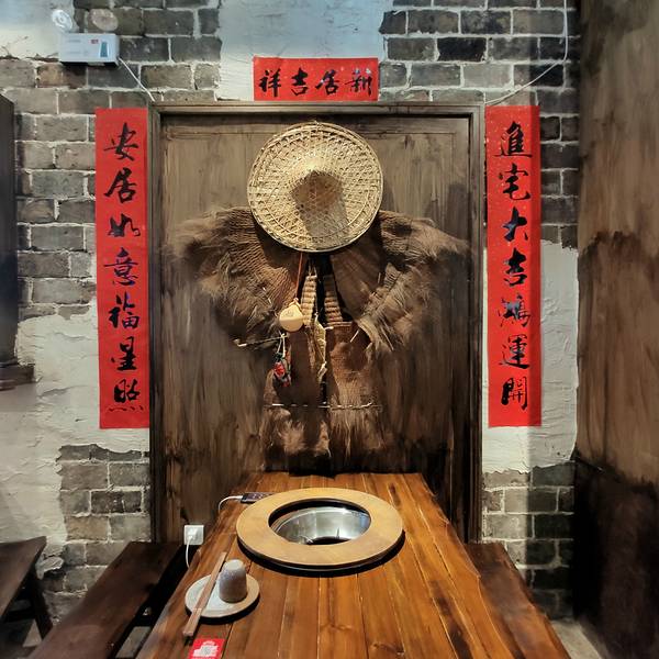 屋内的装修都是仿古的木质桌椅,墙壁上有蓑衣和斗笠作...这家鱼火锅可了不得,是“2019成都微博人气餐厅”