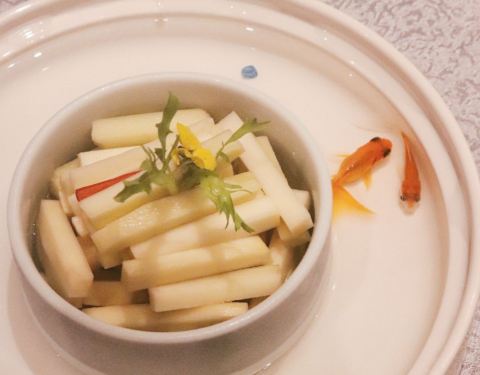 先看看这道开胃泡菜梗,两尾小金鱼欢快游弋,一盏清莲随波逐流。中间的时蔬梗如一座青山,正所谓清水出芙蓉,碧波任逍游,直接将一道菜“演活”了。 松花鱼皮只需轻轻凉拌,便将鱼皮最好的一面呈现给大家,鱼皮花...