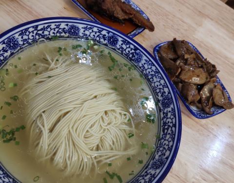 苏式面,我喜欢,点了双浇面:猪肝加爆鱼,都是吾之爱,前者现炒后者凉菜。爆鱼大大推荐,入味,略带焦脆感,好吃。猪肝比较一般,似乎偏老。面是苏式细面,白汤很鲜美,面条建议涨一涨更好吃,或者直接请厨房煮得透些。