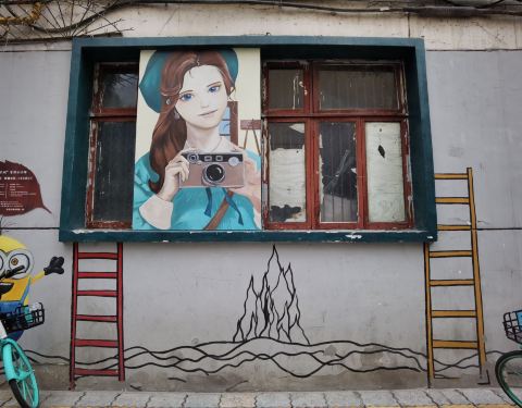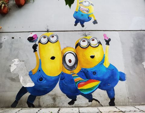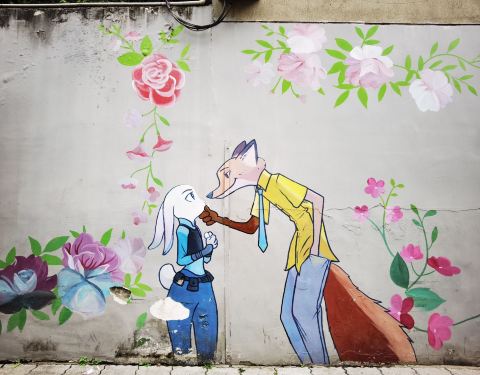 ...,很多涂鸦,有电影情节,也有可爱的卡通人物,很适合拍照,街口还有生意很好的蛋烘糕,也适合打卡…
