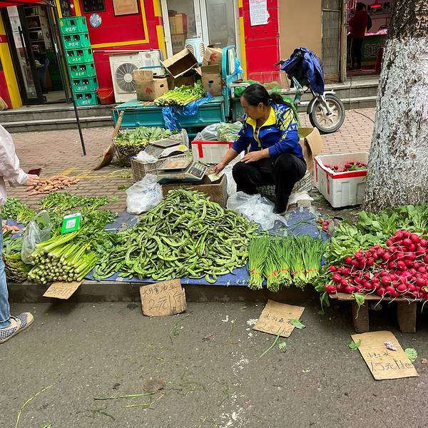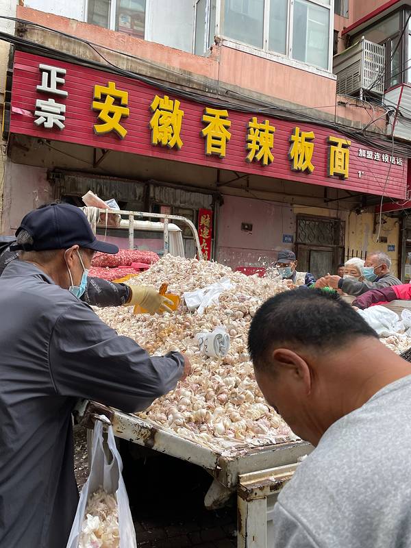红专街早市,哈尔滨最出名的早市,距离中央大街很近。据说排队很凶猛,今天已经接近休市,没排几个人,玫瑰豆沙馅,乘热吃还是美味的。尹胖子油炸糕,只买了2个,1.50元一个。一车大蒜,很是排场。买了黄色的水果...