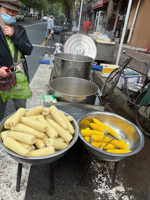 红专街早市,哈尔滨最出名的早市,距离中央大街很近。据说排队很凶猛,今天已经接近休市,没排几个人,玫瑰豆沙馅,乘热吃还是美味的。尹胖子油炸糕,只买了2个,1.50元一个。一车大蒜,很是排场。买了黄色的水果玉米,粒大饱满,软糯可口,2.50元/个。