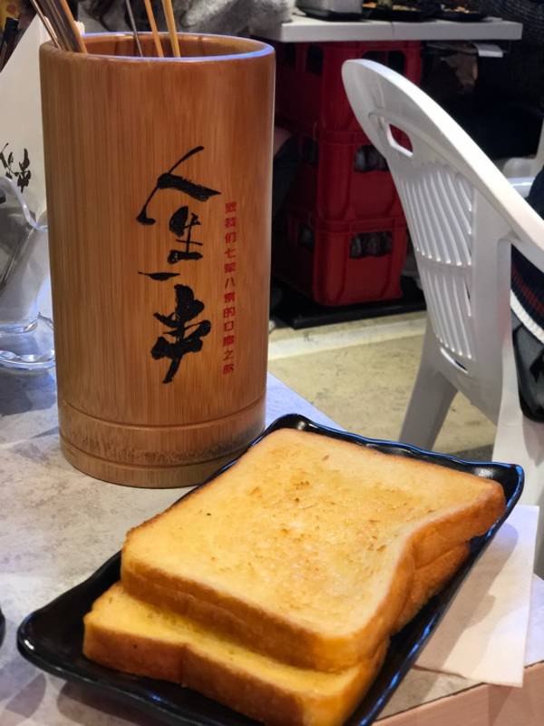 串串确实很好吃,猪鼻筋、黄油面包片都是特色,所有的串串都是帮我们烤好上来的,会有一个暖锅保持温...