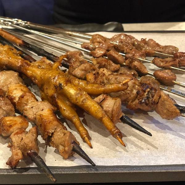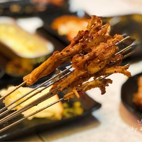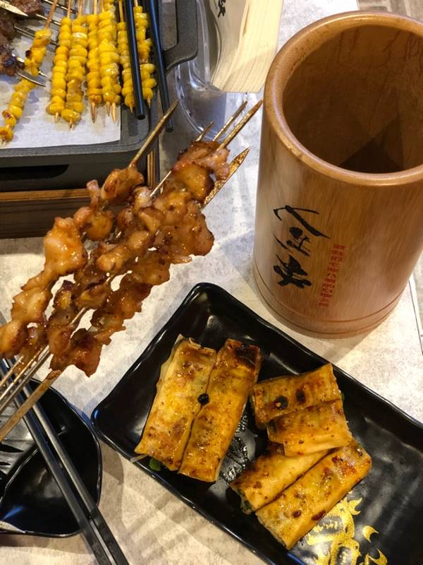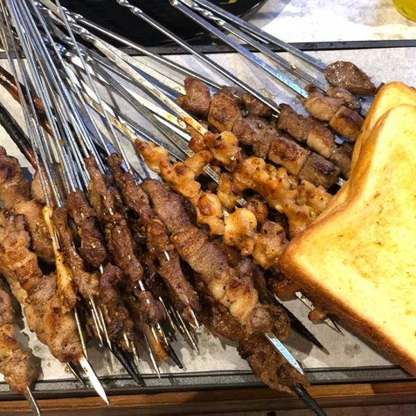 真的很火的一家店,为了不排队很早就来了。 装修风格是简洁工业风夹杂香港市井风,有很浓郁的港片即视感,还有80后的童年回忆游戏机。 上来二话不说就开点,各种特色串串来一波,上菜很快,怕冷掉每个桌子上还配一个暖暖的铁板烧。 猪鼻筋一把,这个是特色,很有嚼劲,吧唧吧唧就吃完了 ,非常弹牙。 岳阳的牛油小串真的很喜欢,一点也不腻,有点点入口即化的感觉,烤的焦香四溢,一点都不油腻,只剩下牛油的鲜香,一口咬下,牛油在口中炸开,赞~不够吃呀不够吃~ 云南昭通小串,整整一把,肉很香,特别好吃,唯一的遗憾就是每串的份量很少,不愧为小串。因为很小,所以调料入味,肉质紧实细腻。 红柳羊肉串真的很良心,好大一串,肉质细腻而且肥瘦相间,吃起来多汁丰富;内蒙羊肉串也不甘示弱,羊味足,带劲~ 干豆腐卷,我们点的唯一蔬菜。豆腐皮表面烤的稍稍带点焦味,包裹在内的蔬菜汁水丰富,鲜嫩无比,火候把握的恰到好处。 烤黄油面包片一人一片,这个真的推荐,又软又脆又香,而且不像普通的面包片淡而无味,烤的很有特色的,黄油放的恰到好处,在烤炙过程中,黄油的香味完全渗透入面包之中。如果不是因为吃撑了可能会加点的! 掌中宝和鸡胗都很好吃,嚼嚼更香,掌中宝算是每家烧烤店都会有的菜品,这里也能做的特别好吃,一口咬下,咯吱咯吱地作响~ 味道总体都是好吃的,而且一点也不腻味,吃多了不觉得咸,保留了食材本身的味道,火候和调料都是恰到好处,吃完走的时候还是很多人。 总而言之,这算是烧烤的宝地了,一网打尽天南地北的所有烧烤。在一家店就可以吃到所有特色菜品,值得再去。