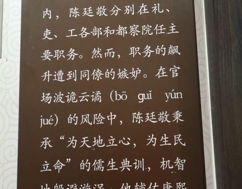 纪念馆位于皇城相府里的一处小院内,规模不太大,门口是大型的陈廷敬石刻浮雕,纪念馆通过大量图文资料向游客介绍陈家的发迹史及陈廷敬作为康熙帝师的光辉一生,同时大量讲诉了陈廷敬编修《康熙字典》的情况。